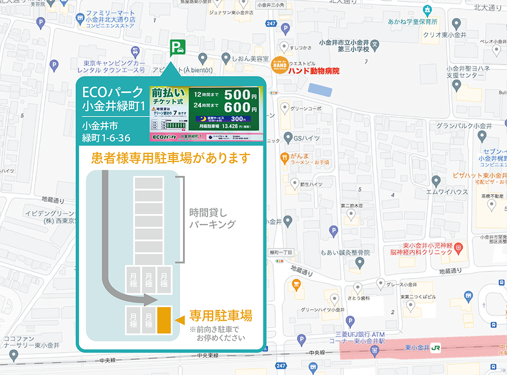 お車でお越しの際は、「ECOパーク小金井緑町1」内の当院専用駐車スペース(無料)、もしくは近隣のコインパーキング(有料)をご利用ください。